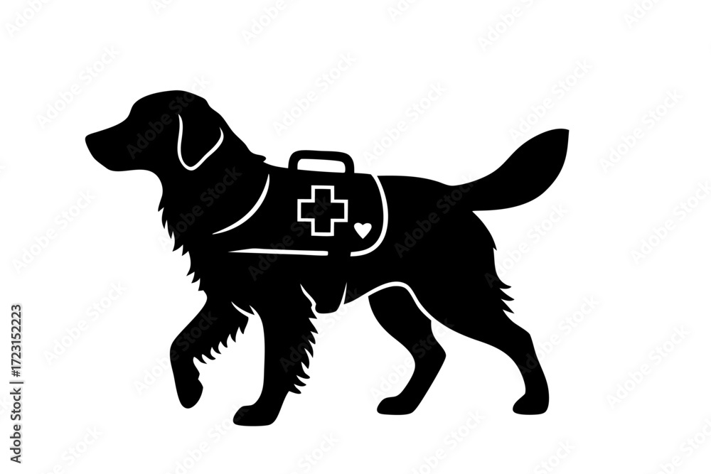 Black silhouette of service dog wearing medical assistance vest. Clipart image isolated on background. #1723152223