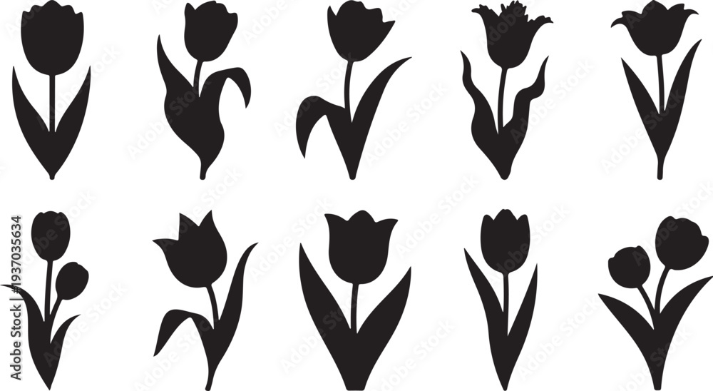 Black Silhouette Tulip Flowers in Various Styles and Arrangements petals #1937035634