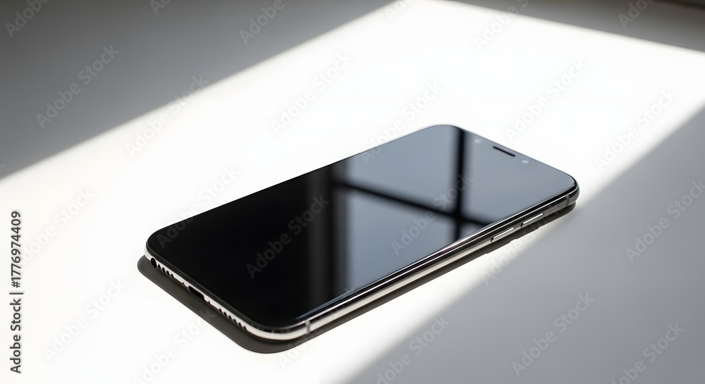 Black Smartphone Lying on White Surface with Natural Sunlight Stripe #1776974409