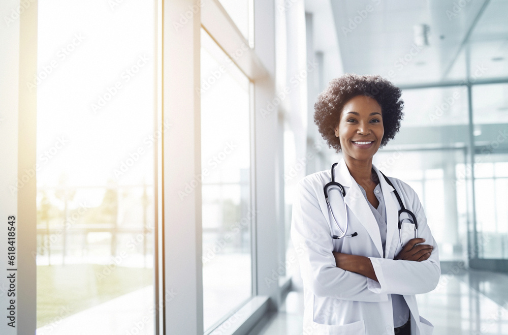 Black woman, doctor or portrait with arms crossed in hospital for trust, confidence or smile in medical clinic for professional about us. African gp, happy or ai generated healthcare worker by window #618418543
