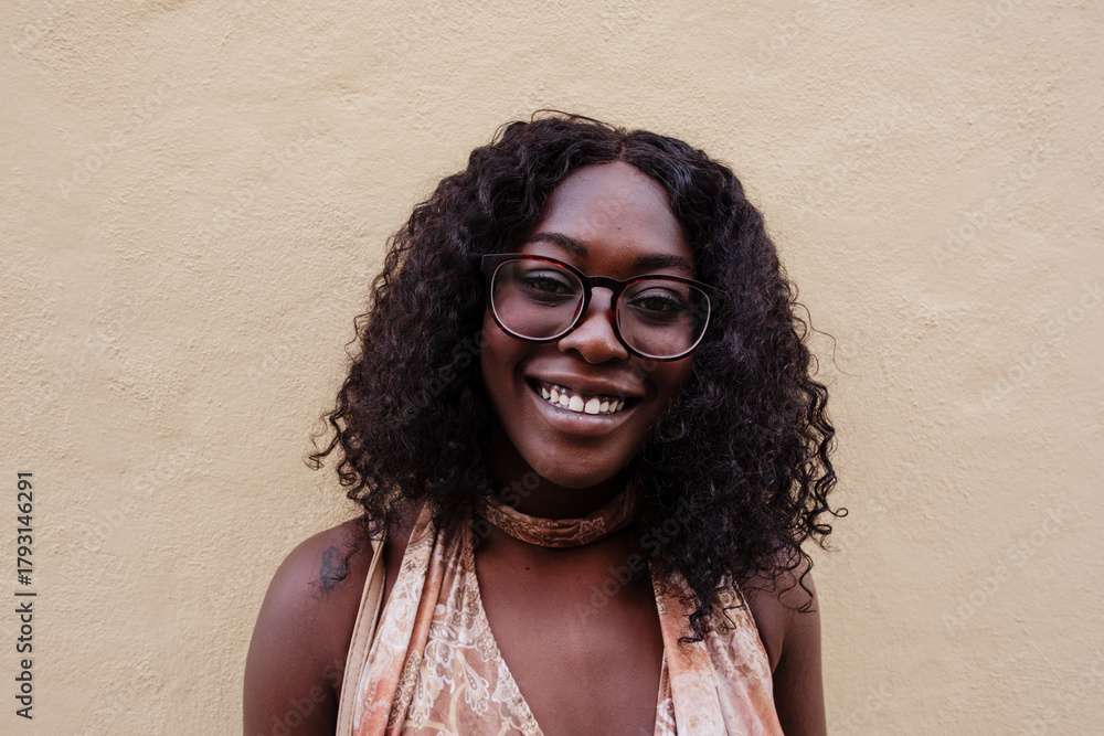 Black woman smiling, wearing glasses and showing joy #1793146291