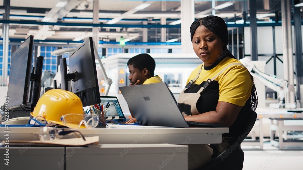 Black woman technician testing solar panel designs on industrial software, working in alternative energy manufacturing plant. Female engineer optimizing the production line. Camera B. #1742891930