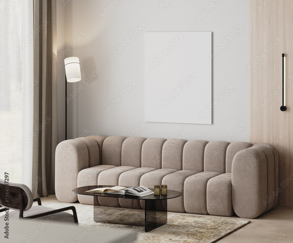 blank canvas mock-up in modern living room interior with beige sofa, floor lamp near curtains, glass coffee table and armchair, 3d render #1766017297