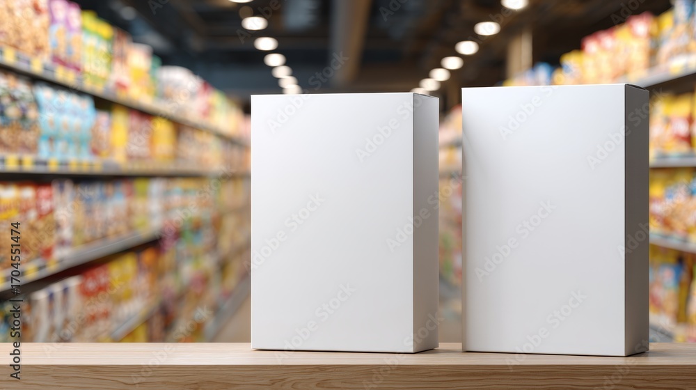 Blank cereal box template on grocery store shelf. Modern packaging mockup #1704551474