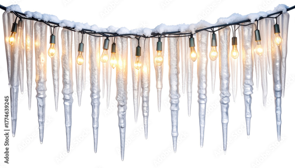 Blank icicle style winter lights strand mockup, hanging vertical droplets of tiny bulbs along a single header wire, isolated on transparent background, png #1774639245