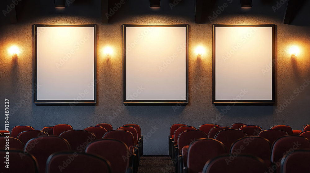 Blank movie posters illuminated by spotlights. Vector realistic mockup of white picture frames on gray tiled wall in cinema, theater or gallery. Empty advertising banners with black border and lamps #1194481027