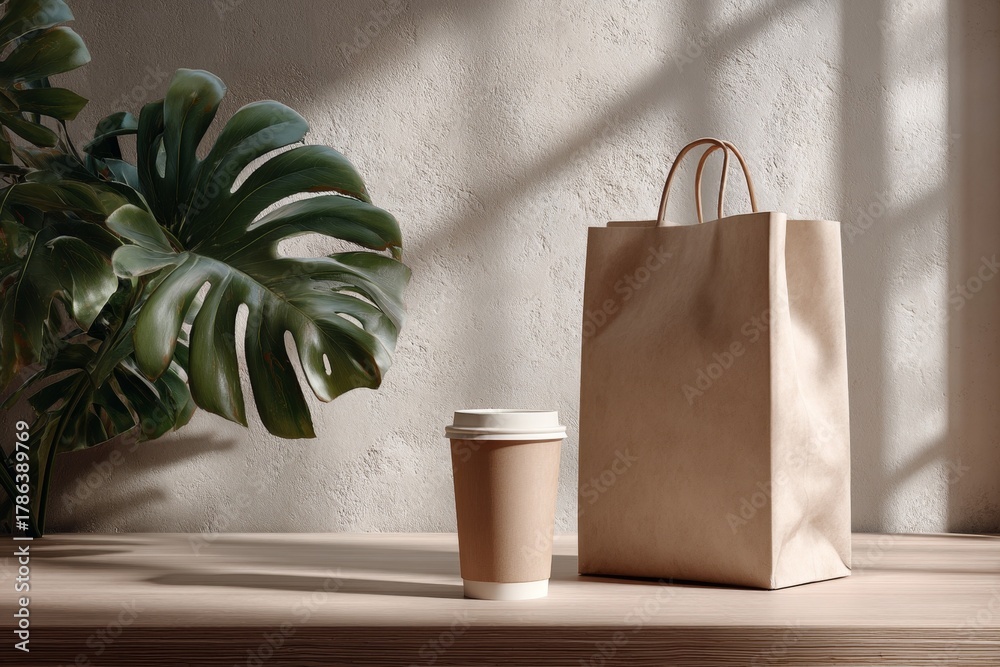Blank paper bag mockup and a coffee cup on a wooden table in front of a window with a monstera plant and deep shadows. Eco-friendly packaging template, cozy retail design display with natural light. #1786389769