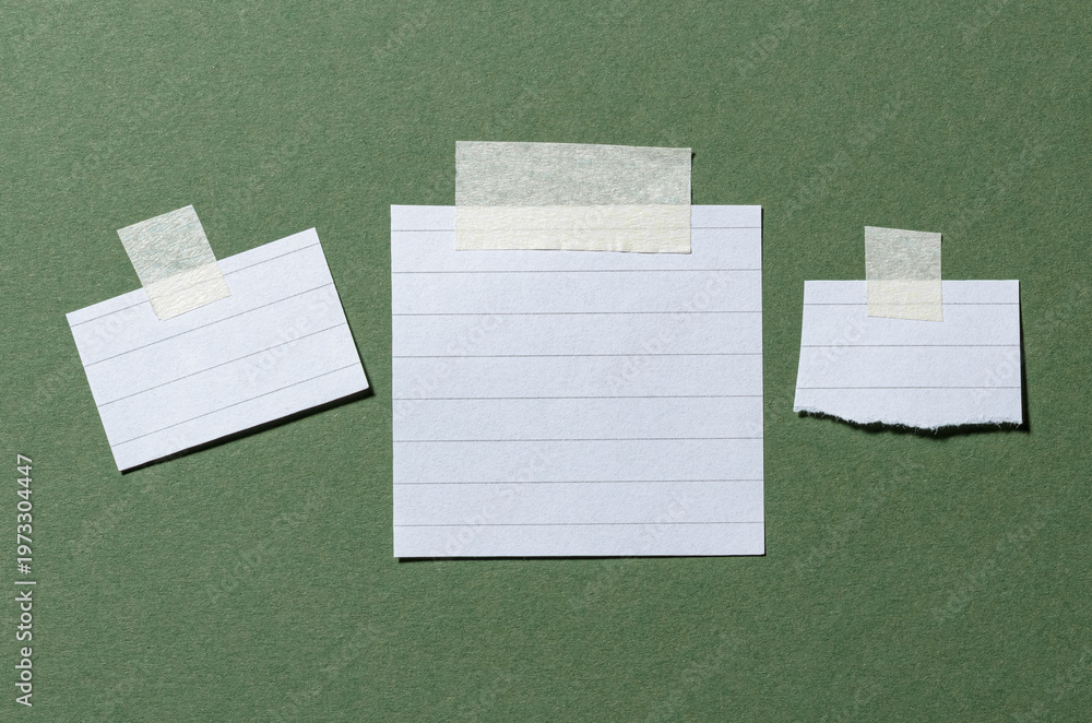 Blank ruled white paper memo notes or reminders with lines and copy space for text with adhesive sticky tape on green background flat lay top view #1973304447