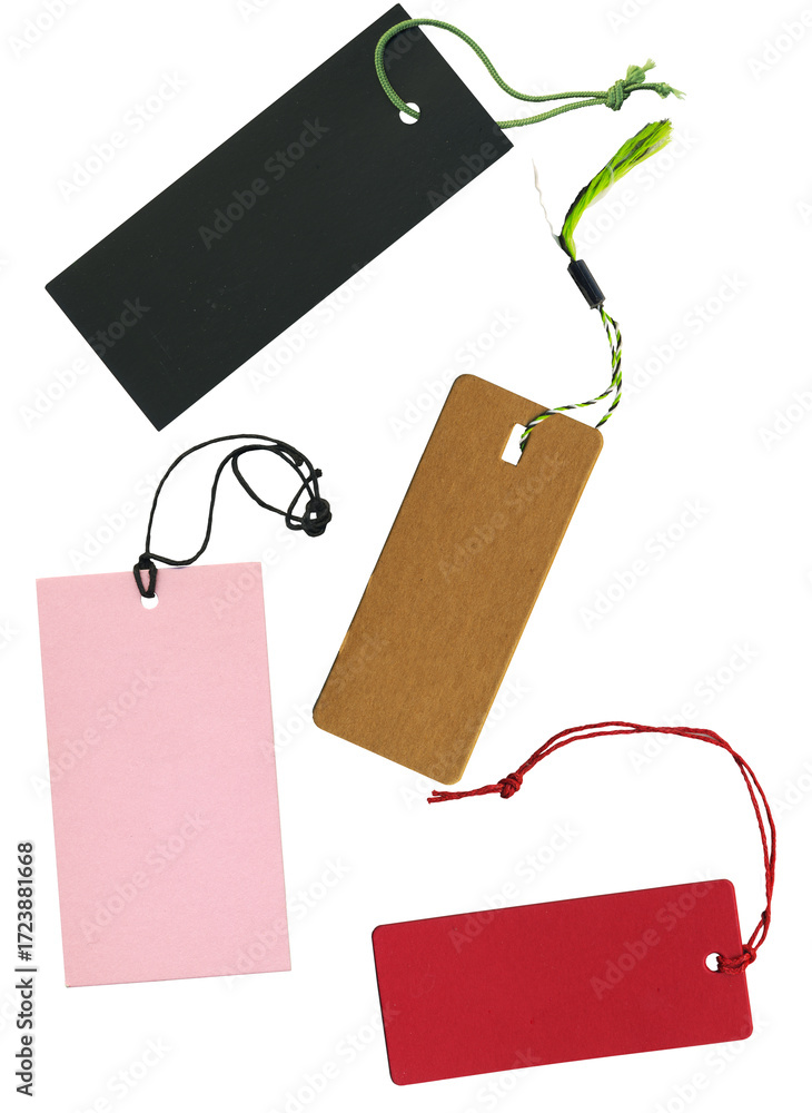 Blank tags tied for hang on product for show price or discount isolate on white background. Free copy space. Isolated on transparent background. #1723881668