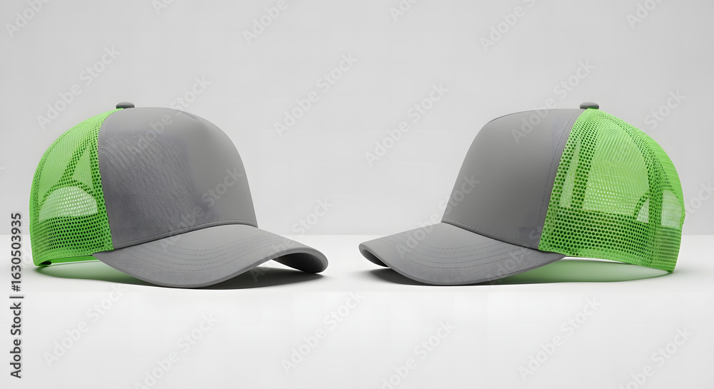 Blank two-tone trucker cap mockup with gray front and neon green mesh. A pair of hats isolated on a white background for brand design placement. #1630503935