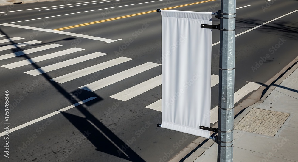 Blank White Banner on Street Pole at Crosswalk, Sunny Day #1751785846