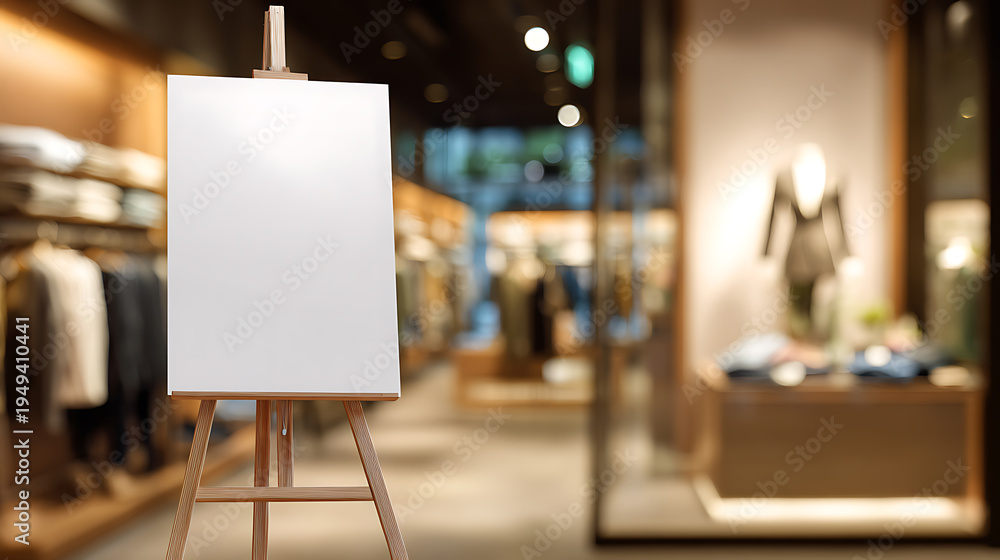 Blank white canvas on wooden easel stand in stylish clothing store, soft focus background, copy space for message or advertisement #1949410441