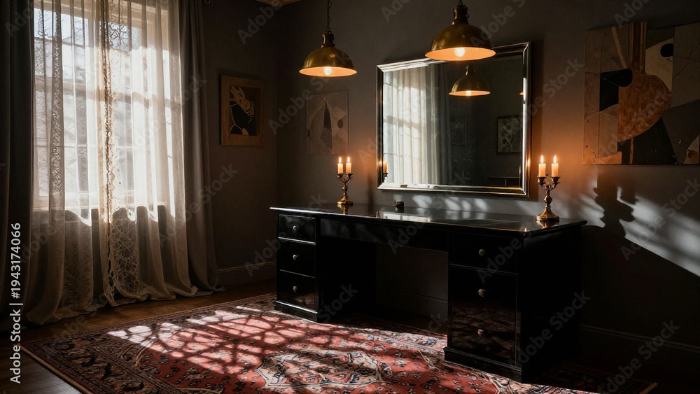 Blick in den Innenraum eines lichtdurchfluteten Wohnzimmers mit Kommode, Kerzen und Teppich #1943174066