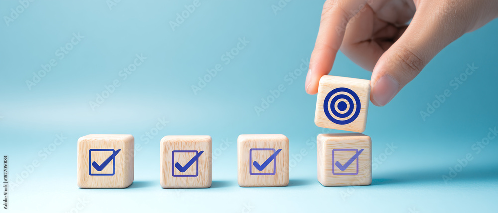 Blocos com marca de verificação e alvo simbolizando metas atingidas, organização, planejamento e controle de qualidade. #1927050183