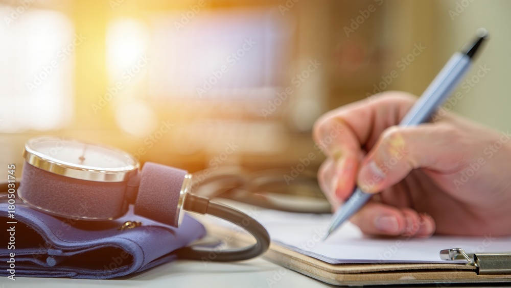 Blood-pressure cuff coiled beside clipboard at patient intake station in clinic #1805031745