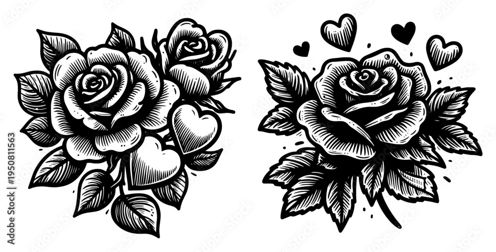 Blooming rose flowers with hearts set, romantic floral tattoo design, valentine's day love roses woodcut style #1950811563