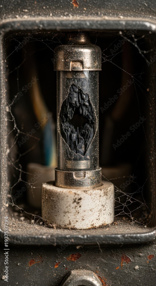 Blown electrical fuse displays significant internal damage within an old housing surrounded by cobwebs #1937537294