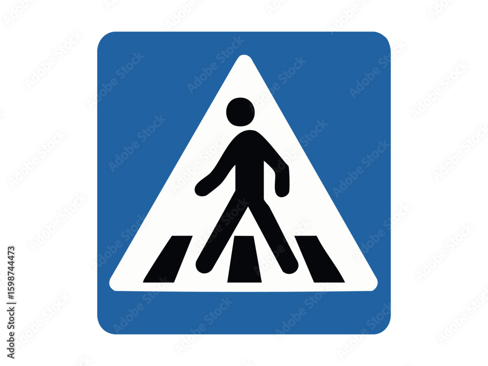 Blue and white pedestrian crossing traffic sign with black silhouette of walking person. concept of traffic, safety, road sign, pedestrian, caution, icon, instructional design #1598744473