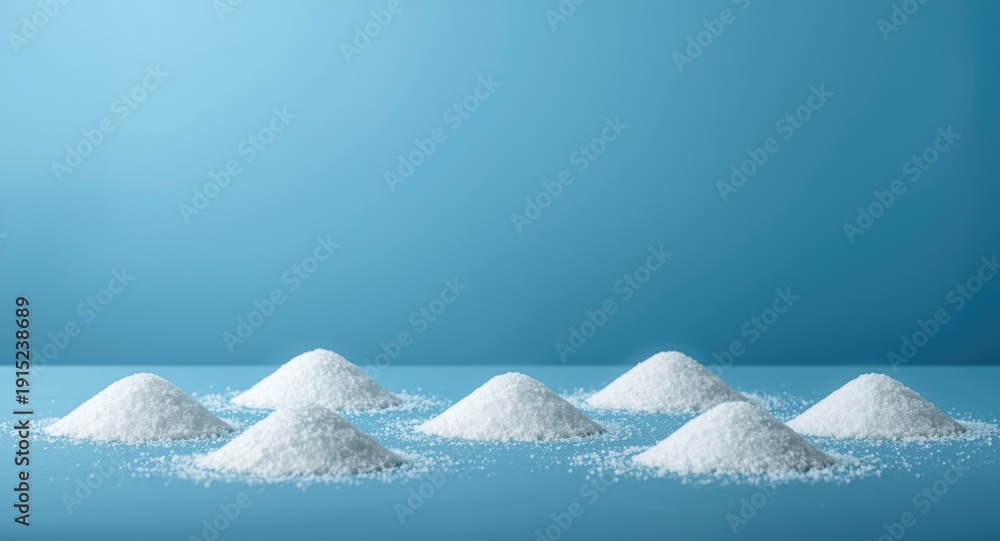Blue background softly framing white sugar piles on a smooth surface with ample space for text copy #1915238689