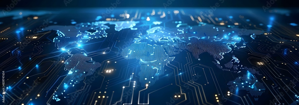 Blue digital world map with glowing network lines and data points, ideal for global communication and information technology themes #839747654