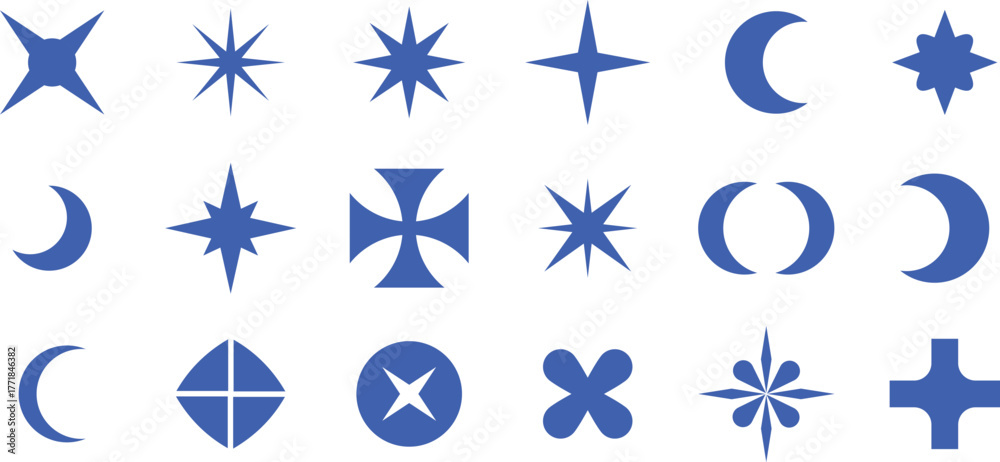 Blue geometric star and moon abstract symbol set, modern minimal vector shape collection, creative design, icon, graphic, background #1771846382