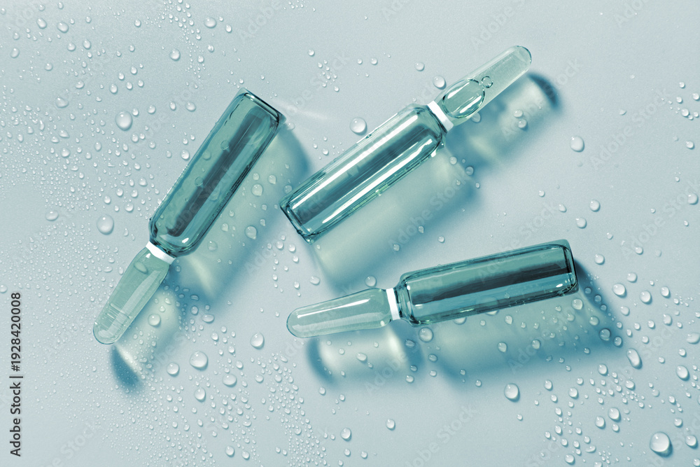 Blue glass ampoule injection or serum moisturizer booster on wet surface. Beauty product sample swatch. #1928420008