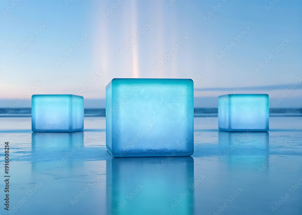 Blue glass cubes on reflective surface, minimal futuristic 3D background #1916008214