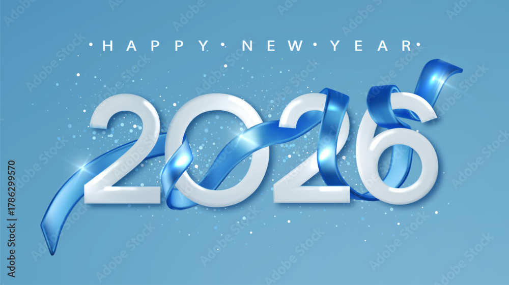 Blue 2026 Happy New Year with realistic 3d ribbon. Festive Christmas banner for holiday with realistic number 2026. #1786299570