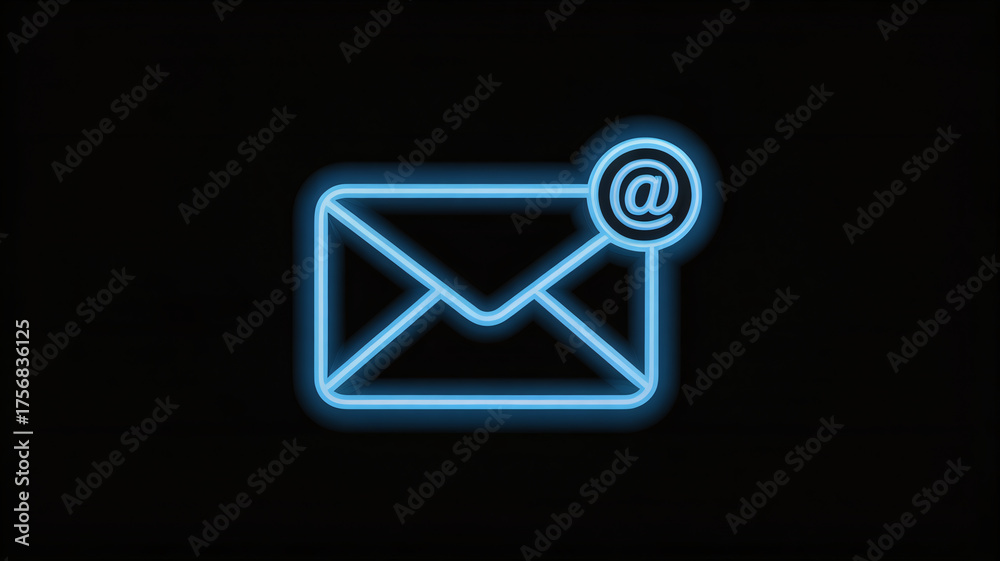 Blue neon email envelope icon with at symbol notification glowing on a dark background, digital communication concept #1756836125