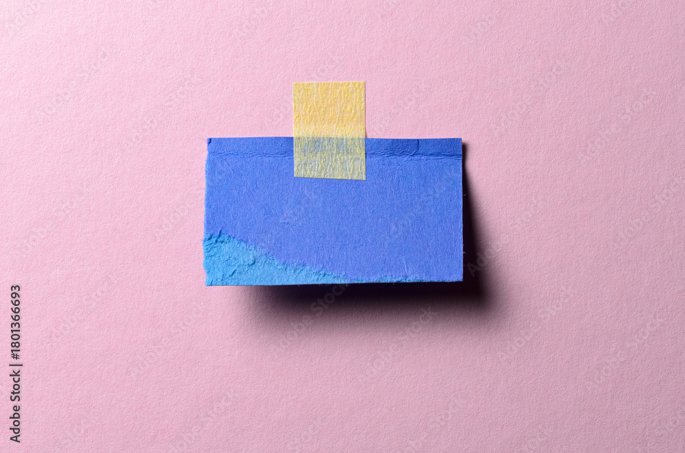 Blue paper note with rough texture edges and adhesive tape with copy space for text on pink background #1801366693