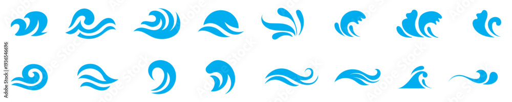 Blue waves and splashes of water set. Swirls, curves and flow of liquid clip art. Silhouette of water flows, vector elements on a white background. #1936546696