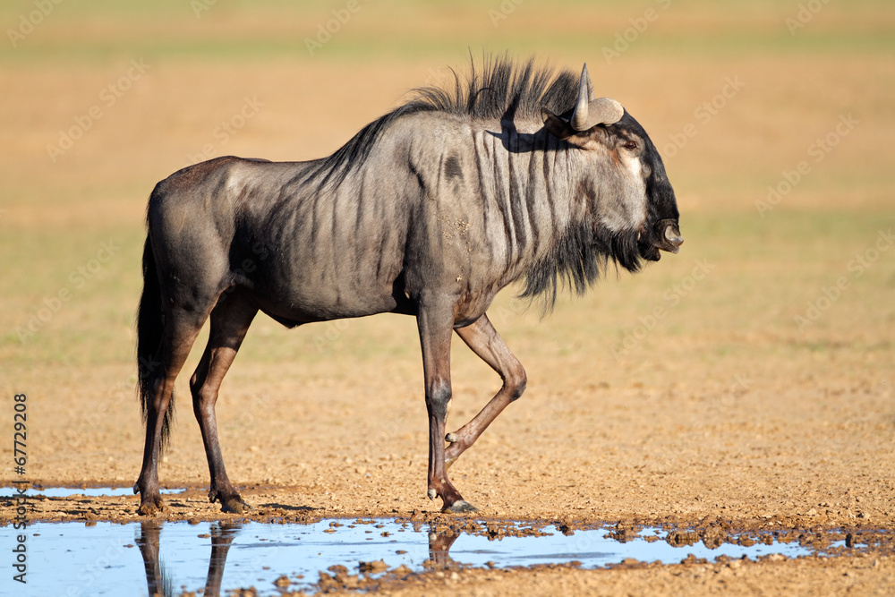 Blue wildebeest at a waterhole, Kalahari desert #67729208