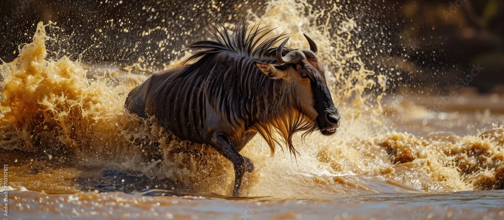Blue wildebeest (connochaetes taurinus) narrowly escaped death when attacked by a crocodile while crossing the Mara River. #703107671