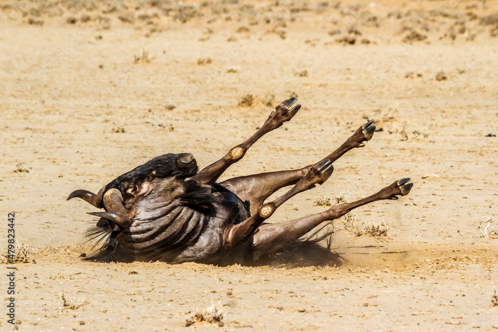 Blue wildebeest rolling over in sand in Kgalagadi transfrontier park, South Africa ; Specie Connochaetes taurinus family of Bovidae #479823442