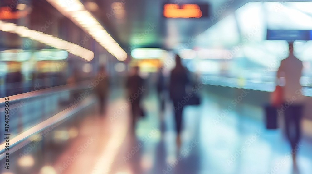 Blurred airport hallway with unrecognizable passengers at check-in counters #1747549605