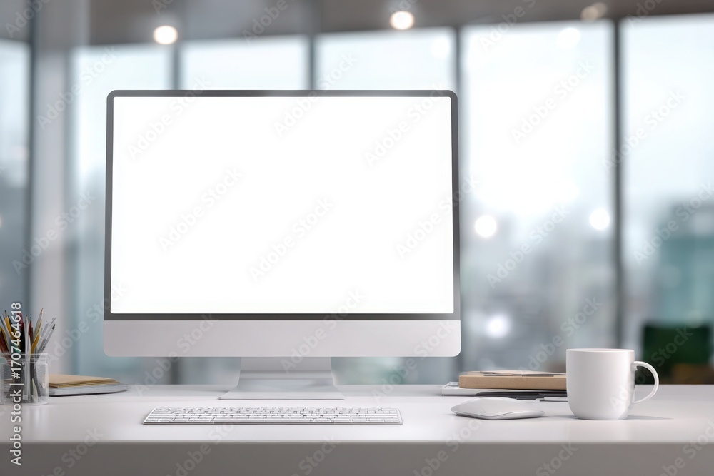 blurred background of a modern office interior with a white desk and computer monitor mockup, a minimalist work space for a graphic designer or web developer, with copy space. #1707464618