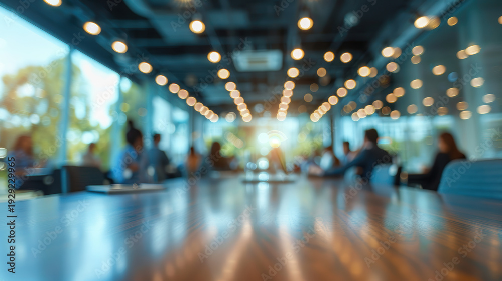 blurred Business Team Meeting in Modern Glass Office with City View and Sunset Light #1929229965