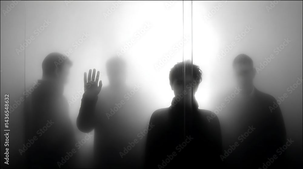 Blurred figures appear behind an opaque wall. One figure has a hand up. #1436548632