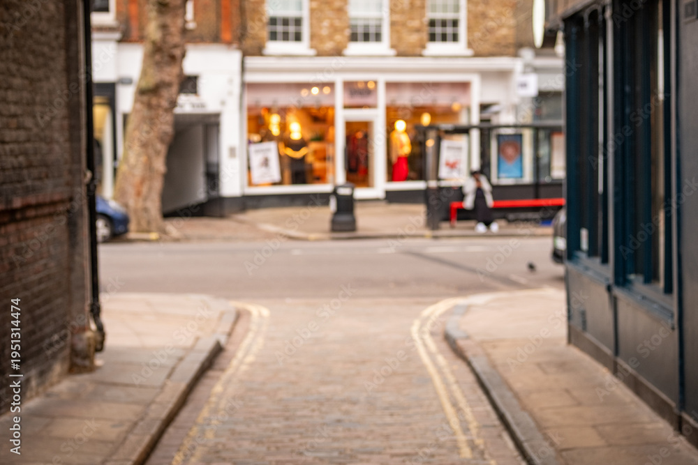 Blurred London High Street Shops – Narrow Alley Leading to Retail Shopping Scene Concept #1951314474