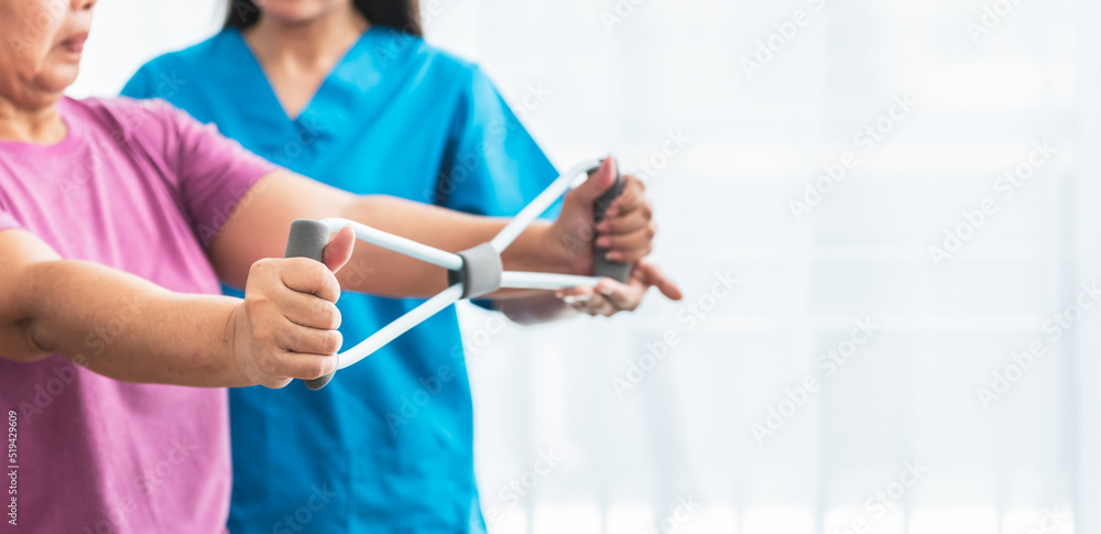 Blurred soft images of Physical therapist doing and using equipment to support arm muscles for elderly woman, to nursing home and health care concept. #519429609