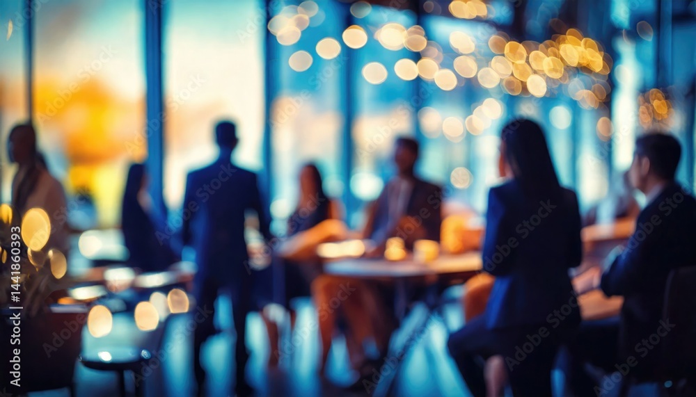 • #1441860393 Blurry image of business professionals networking at a corporate event in a modern glass-walled venue during the evening