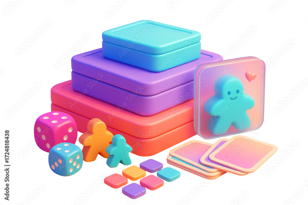 Board game elements including dice, cards, tokens, and boxes in vibrant pastel colors, isolated on white background. Concept of hobby and leisure. Ai generative #1724818438