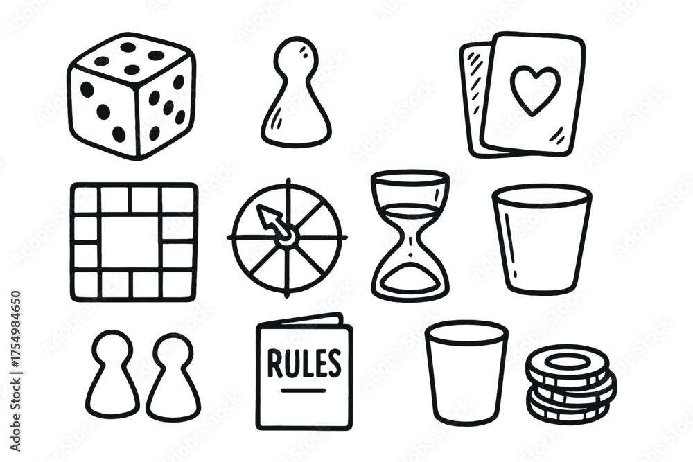 Board Game Icons. Board games doodle icon set: hand drawn icons of dice, pawn, card deck, board, spinner, hourglass, tokens, rule #1754984650