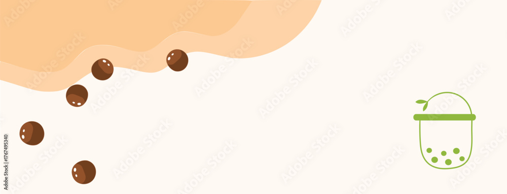 Boba tea banner with rolling tapioca pearls and minimalist green cup on creamy beige background, playful bubble milk tea header for menus, cafés, and social posts. #1767495340