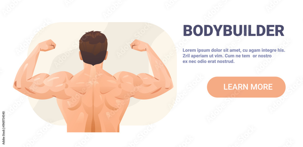 Bodybuilder flexing muscular back strength fitness male showing biceps on light abstract background website banner template #1969734540