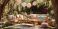 Boho summer garden party with rattan furniture, lanterns, floral centerpiece and pastel pillows in a sunlit backyard. Inviting outdoor setup for festive and stylish gathering. #1928086945