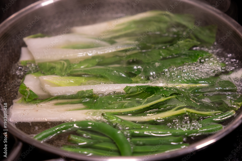 Bokchoy vegetable is being boiled in water in a pan #1903011458
