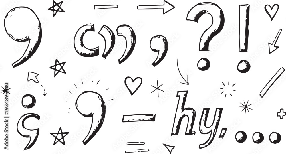 Bold hand-drawn black doodle icons set, including arrows, hearts, speech bubbles, sunburst, crown, question mark, and swirl lines in a casual sketch style. #1934895630