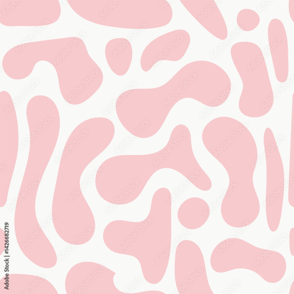 Bold pink and white seamless pattern with cow and dalmatian spots, featuring irregular shapes. Great for creative decor, textiles, and wallpapers. High quality vector design. #1426682719