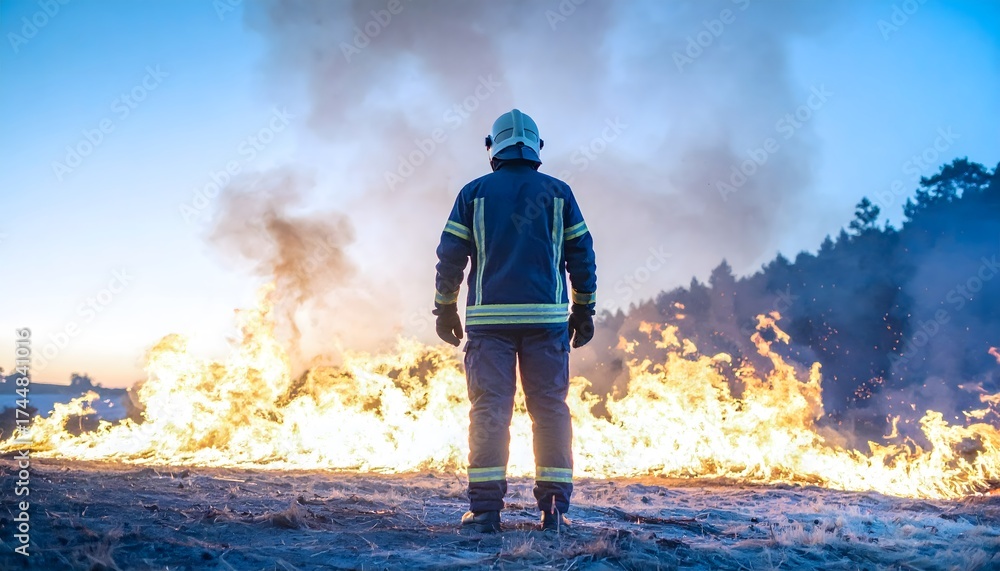 Bombero de espaldas frente a un incendio forestal al atardecer con humo y llamas intensas #1744841016